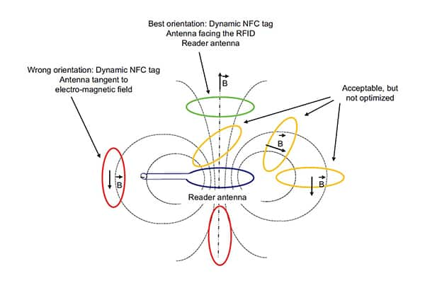为了实现NFC设备所需的电感耦合,需要将天线置于适当的方向上(图片来源:STMicroelectronics)