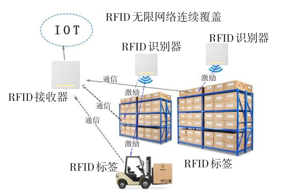 通过空间隔离消除了单个设备射频干扰,通过频分调度避免了设备间的干扰,实现了区域连续覆盖,就可以使RFID设备自动去感应区域内所有RFID标签。设备间的干扰问题解决了,RFID设备就可以组成网络,通过连续组网,提供米级精确定位能力。