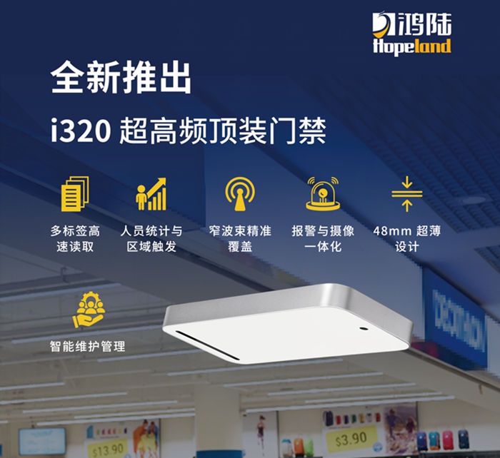鸿陆i320顶装门禁通道采用超高频技术采集数据,实现对物品的盘点、统计、比对等管理工作;该产品支持ISO18000-6C协议,工作频段支持国标920MHz~925MHz、FCC 902MHz~928MHz,输出功率0dBm~35dBm可选;内置高增益窄波束天线,借助摄像头智能算法能判断标签移动方向;防漏读和误读性能好,具有无感式触发、识别距离远、多标签识别能力强、抗干扰能力强、可扩展性好和安装使用方便等特点;可广泛适用于服装商超零售、人员出入管理、固定资产、图书档案管理、智能仓储管理、租借管理等场景。