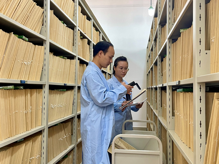 工作人员在用RFID手持设备将档案扫描入库